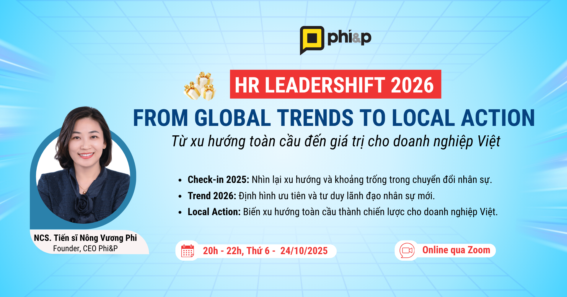 Nhân dịp Sinh nhật Phi&P, chúng tôi gửi đến bạn món quà tri ân đặc biệt – Workshop trực tuyến cùng Ms. Vương Phi, dành cho các nhà lãnh đạo và quản lý Nhân sự mong muốn cập nhật xu hướng HR mới nhất, đánh giá thực tiễn 2025 và định hình chiến lược 2026 trên nền tảng kết hợp tư duy toàn cầu – hành động tại Việt Nam.